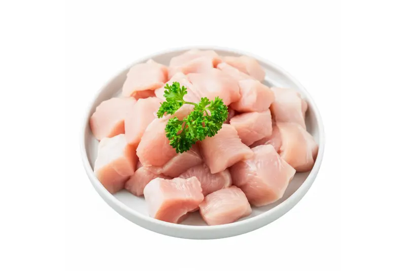 Tacos de carne de pollo limpia y troceada, listos para añadir a sus guisos. Acelere su «mise en place» con este producto de alta calidad.